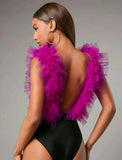 Elevate your wardrobe with the Baddie Club Bodysuit Top, featuring a plunging neckline and layered mesh ruffle detailing. This design combines bold sophistication with delicate texture, offering a flattering silhouette that enhances your natural shape. Perfect for making a statement at any event, its breathable mesh fabric ensures comfort while maintaining an edgy, fashion-forward look.