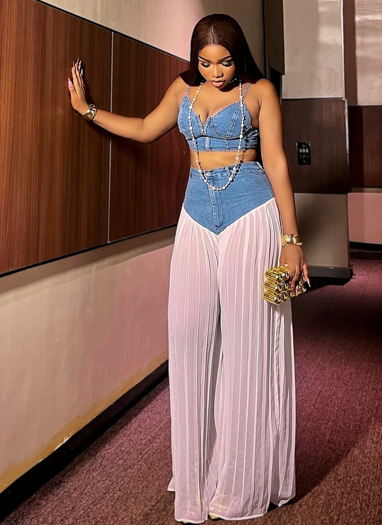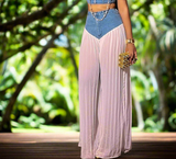 This Mary Jean pants-only piece features expertly tailored pleated denim combined with chiffon fabric, offering a sophisticated balance of structure and fluidity. Designed to complement the New Style Suspender V-Neck Vest, these trousers provide a versatile foundation for a polished two-piece ensemble. Ideal for those seeking refined style with a modern edge.